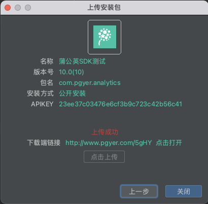 如果上传成功则会提示“上传成功”以及显示该应用在蒲公英的「下载链接」。(这时候不可以再次点击上传按钮)