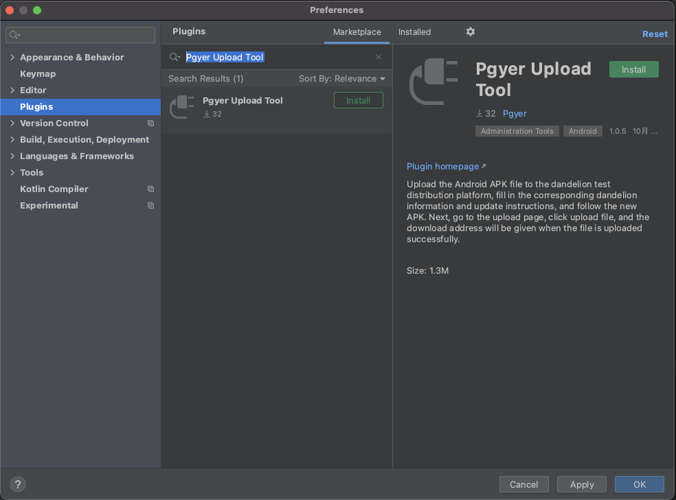 方法一: 打开Android Studio->Preference ->Plugin ->搜索框输入“Pgyer Upload Tool”-> 右边信息栏点击“install”安装。重启Android Studio。