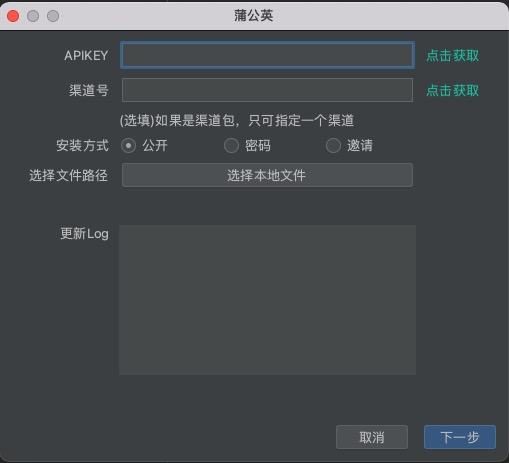 应用图标、应用名称、应用版本、应用包名、安装方式、渠道号(如果是渠道包)、安装密码(选择安装方式为密码)、APIKEY。